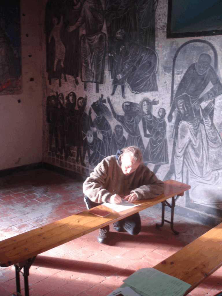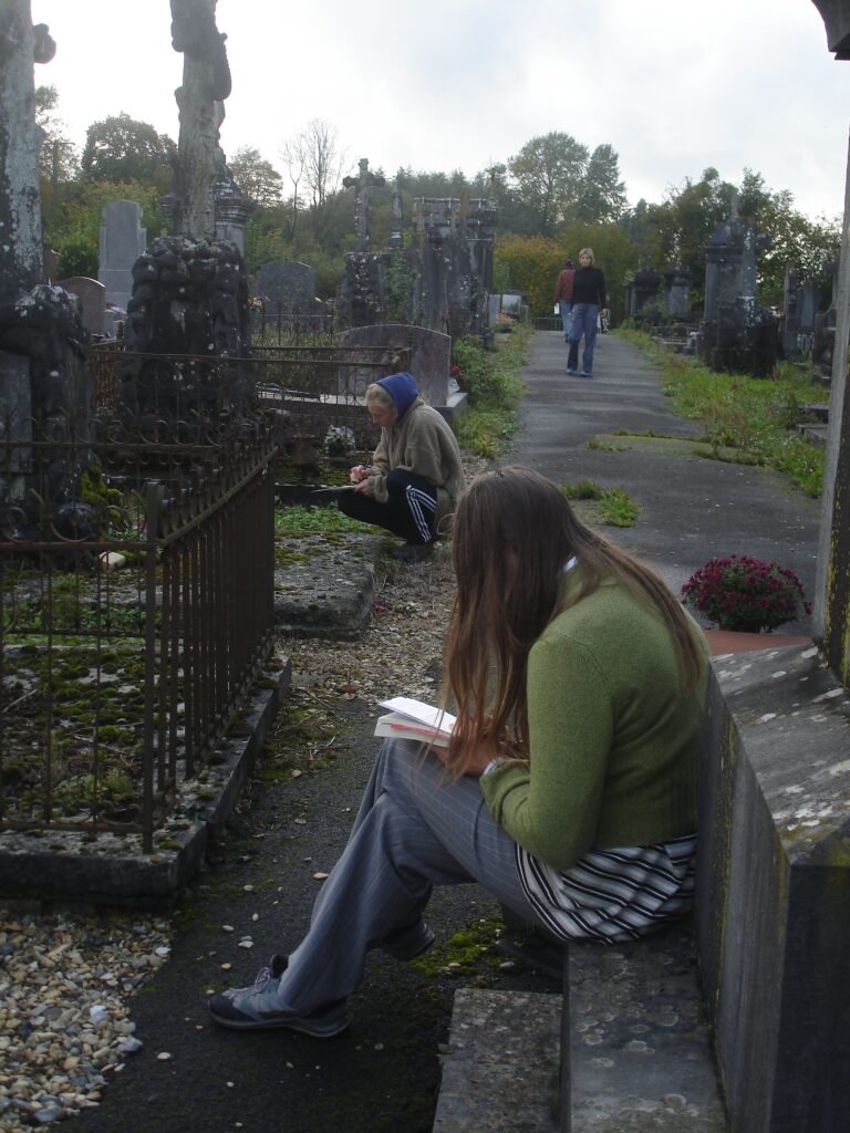 For October School 2023 in Jeantes, France I hosted a collaborative writing workshop on location called To ponder, to dream up: blending fiction and memory. Drawing inspiration from different locations around the house (a graveyard, a church, a tool shed), we invented memories that might belong to these places. Taking in the surroundings, their smells, sounds, sights and surfaces, we spoke from (auto-)fictional characters. Later, these scraps of text were assembled into fragmented stories that we read out loud to each other. These collaborative stories mysteriously felt like they belonged to the same world.
